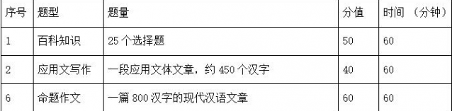 本考试包括三个部分:百科知识、应用文写作、命题作文。总分150分。