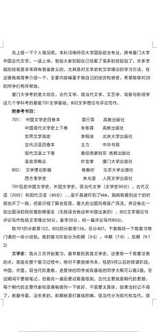 先上报一下个人情况吧。本科河南师范大学国际政治专业,跨考厦门大学中国古代文学,一战上岸。相信大家到现在已经看了很多的经验贴了,许多学姐的经验是非常具有借鉴意义的,尤其是对文学史和文学理论的学习方法,在这里我就简单介绍一下,主要内容偏重于我自己的经历和感受,希望能够对20的同学们有所帮助。 厦门大学考的是大综合,古代文学、现当代文学、文艺学、戏剧与影视学这几个学科考的都是701文学基础,802文学理论与评论写作。 附参考书目: 701: 中国文学史四卷本 袁行霈 高教出版社 中国现代文学史上下卷 朱栋霖 高教出版社 世界文学简史 李明滨 北京大学出版社 古代汉语四卷本 王力 中华书局 现代汉语上下卷 黄伯荣廖旭东 高教出版社 语言学概论 叶宝奎 厦门大学出版社 802: 文学理论新编 杨春时 北京大学出版社 西方美学史 朱光潜 人民文学出版社