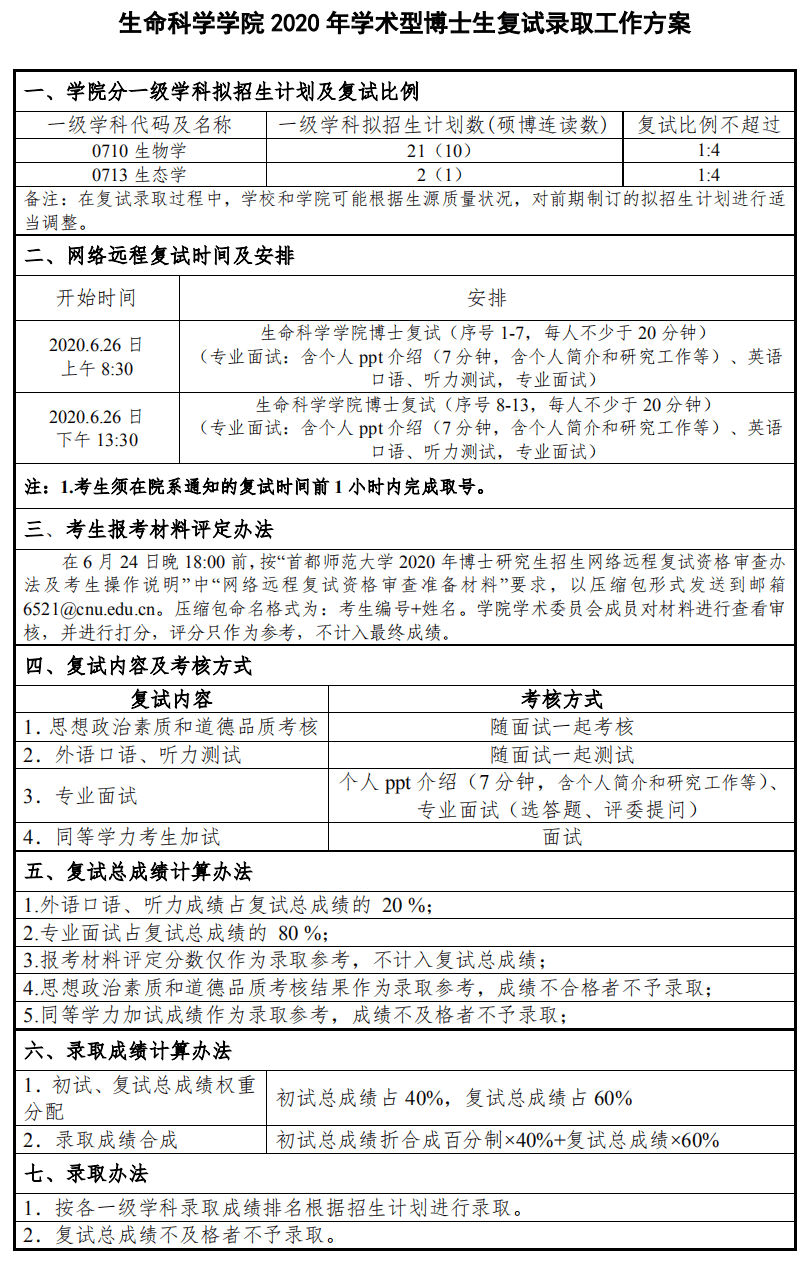 首师大考研辅导班:首师大生命科学学院2020年学术型博士生复试录取工作方案