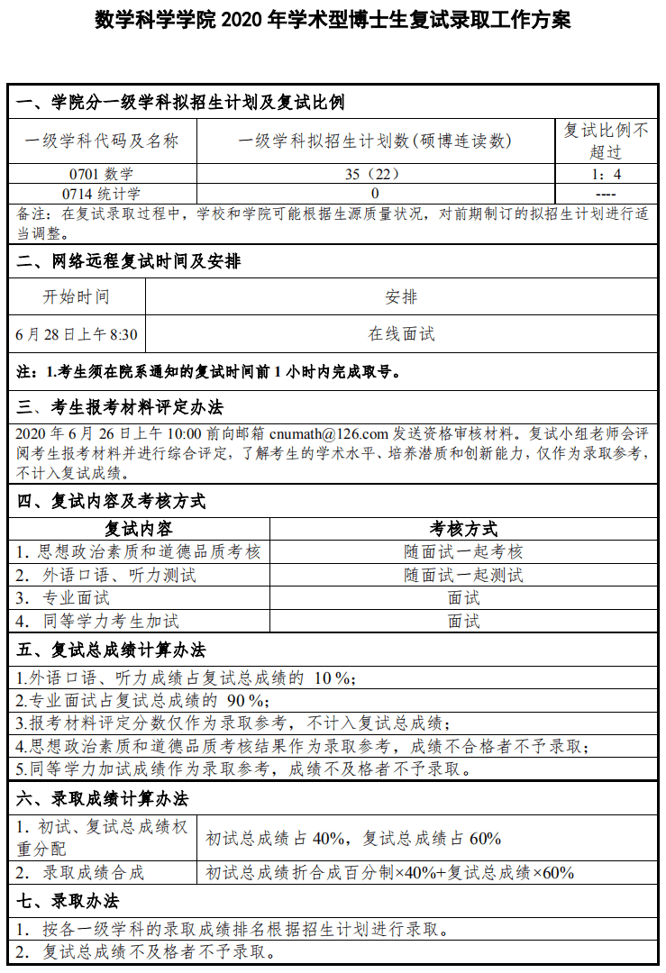 首师大考博辅导班:首都师范大学数学科学学院2020年学术型博士生复试录取工作方案