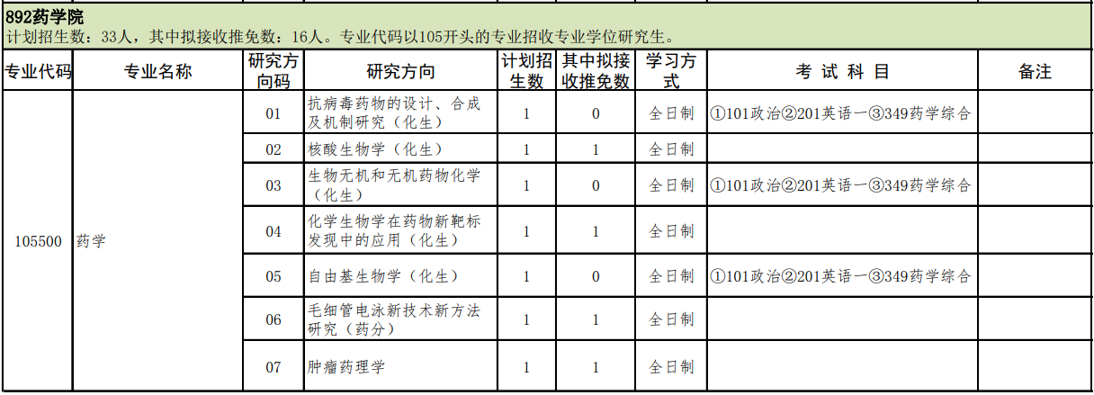 【1】本专业考试科目为:政治,英语,763药学综合(一),970有机化学。