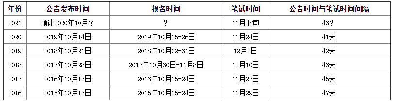 历年国考公告公布时间与笔试时间间隔在43天左右,由此我们推算出2021年国考公告公布时间很可能是1016日前后。具体请以公告发布为准。