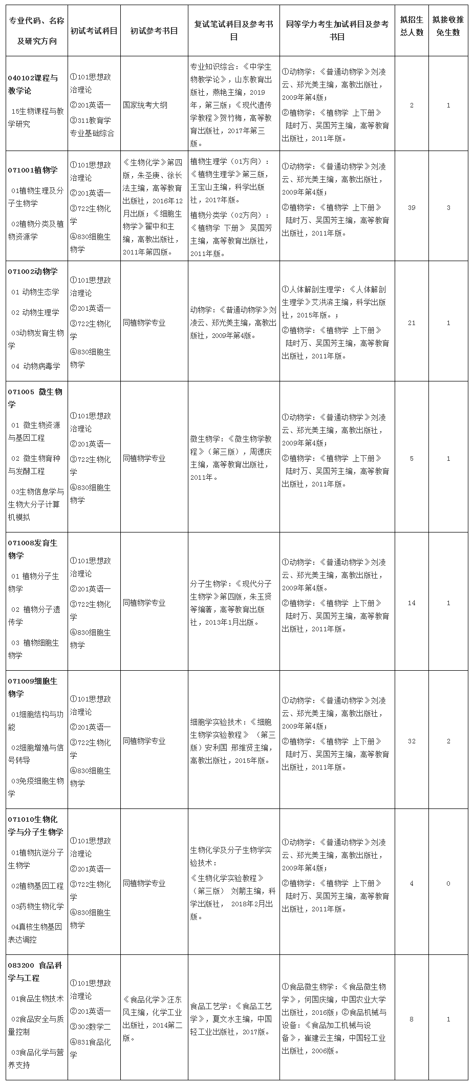 学院有一个生物学博士一级学科,下设有动物学、植物学、细胞生物学、发育生物学4个二级学科的博士学位授权点。拥有生物学及食品科学与工程两个硕士一级学科,下设有动物学、植物学、微生物学、细胞生物学、发育生物学、生物化学与分子生物学、课程与教学论(生物)、生物与医药8个二级学科的硕士学位授权点。植物学与动物学学科进入ESI全球前1%。目前已经形成了完备的留学生教育体系,现有10名在读巴基斯坦研究生。学院拥有一支教学科研力量强的师资队伍,其中博士生导师20人,专兼职硕士生指导教师188人。