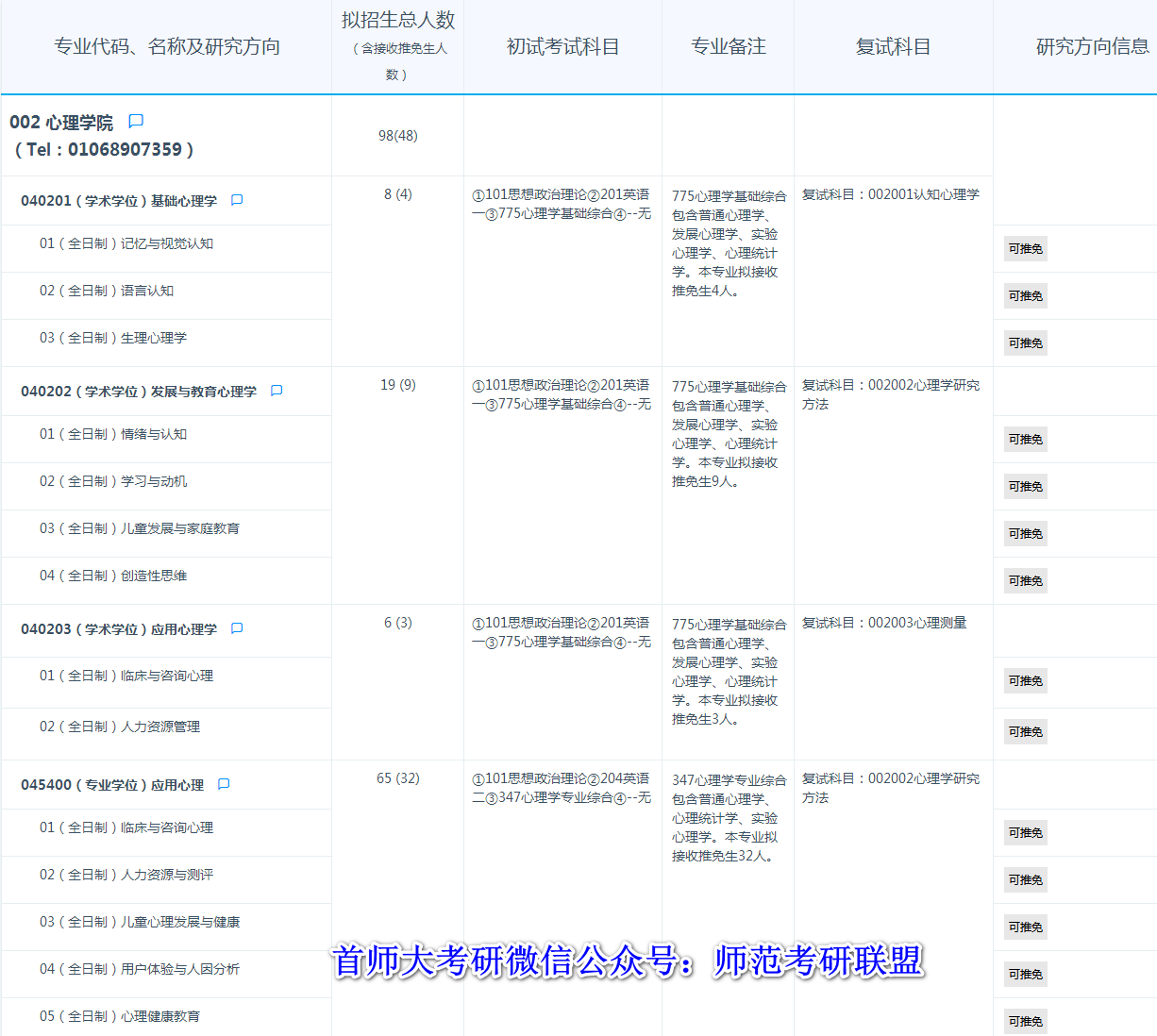 首师大考研辅导班:首都师范大学2021年硕士研究生心理学院考研招生目录及招生人数公布