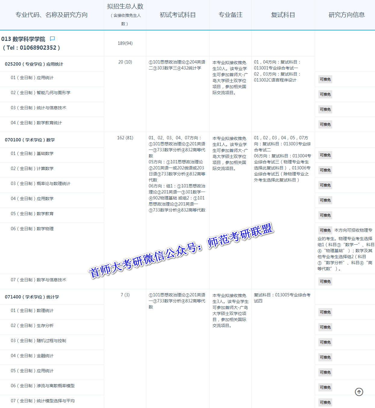 首师大考研辅导班:首都师范大学2021年硕士研究生数学科学学院考研招生目录及招生人数公布