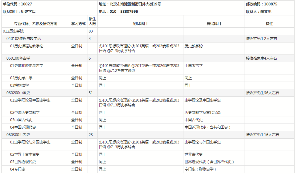 北师大考研辅导班:北京师范大学2021年硕士研究生历史学院考研招生目录及招生人数公布