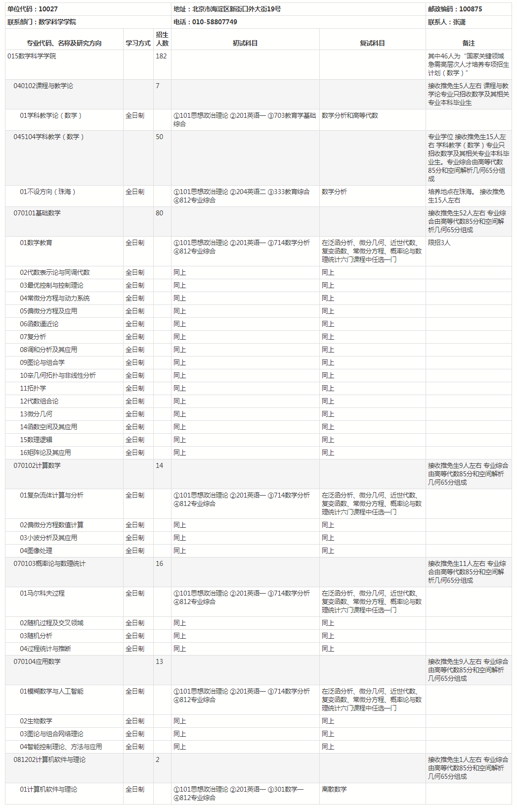 北师大考研辅导班:北京师范大学2021年硕士研究生数学科学学院考研招生目录及招生人数公布