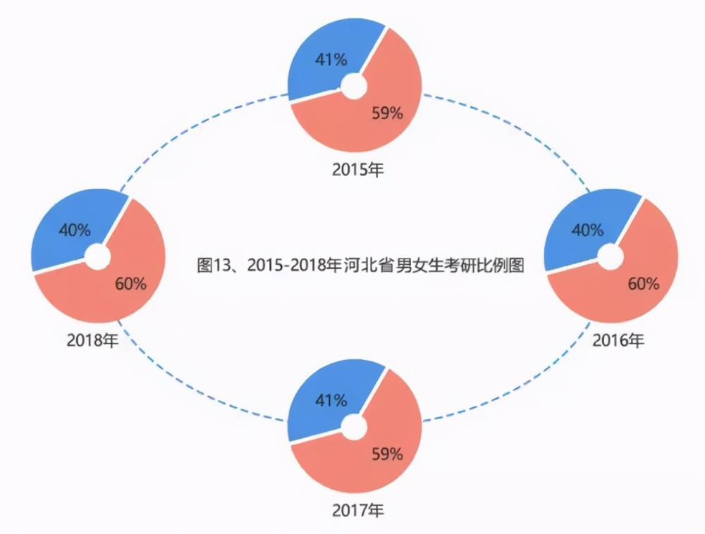 而具体到省份,这个数值则更高,河北省2018及2019年的考研人数女生占比都在60%左右,2015-2018年一直高于男生。在读的女硕士超110万,2013年到2017年,五年增长率达到45%。