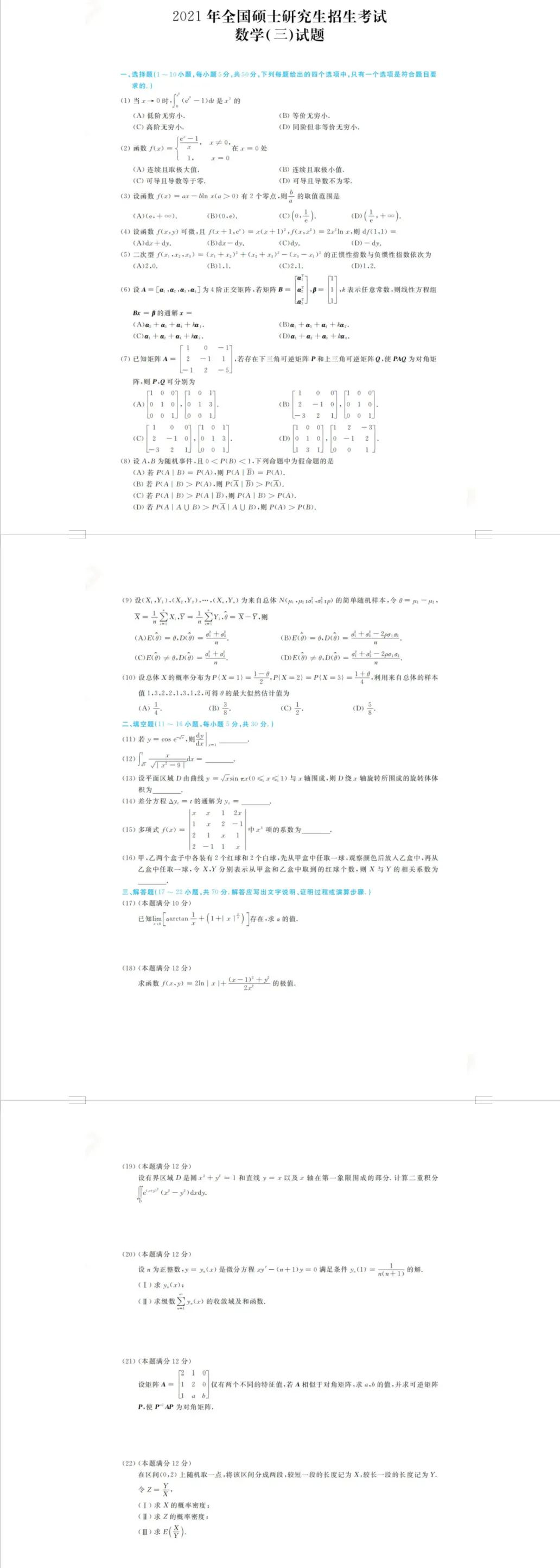 这是21年考研数学三的真题,以供大家参考。