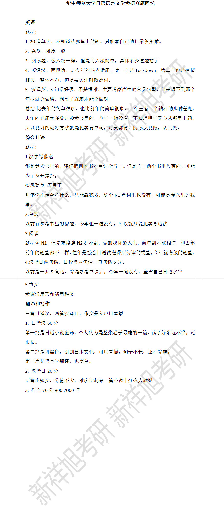 新祥旭考研:华中师范大学日语语言文学2021考研真题回忆