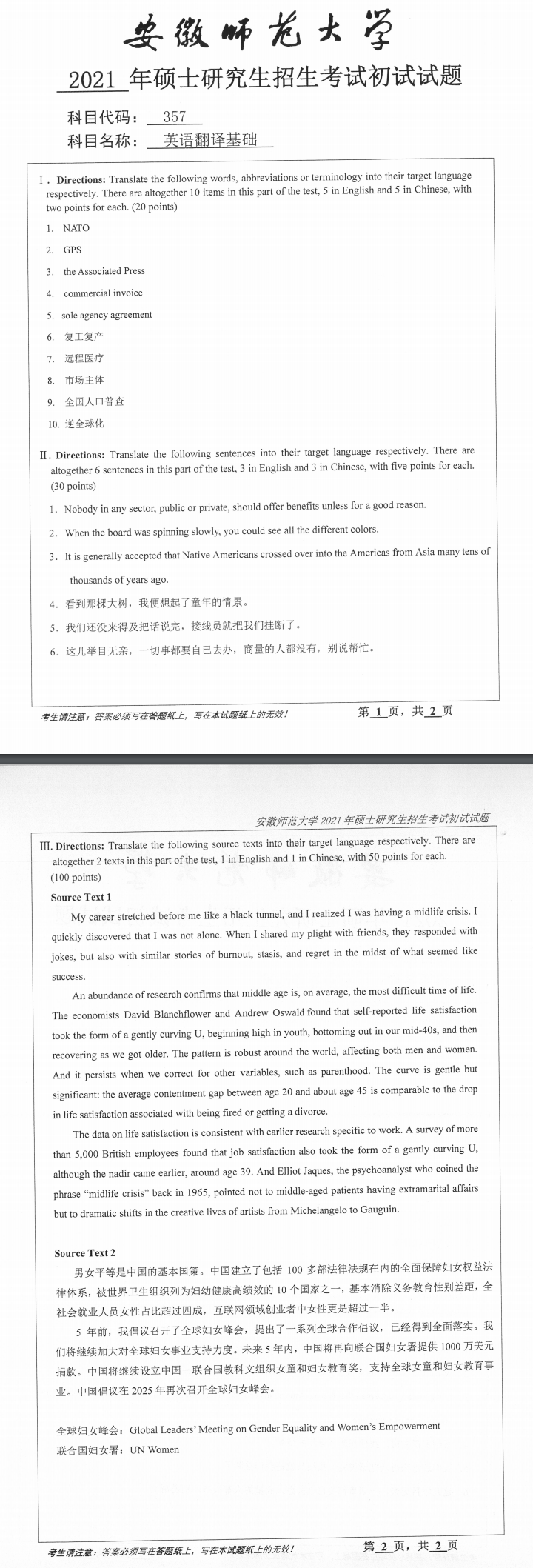 安徽师范大学考研辅导班:2021年安徽师范大学MIT翻译硕士考研357英语翻译基础考试真题