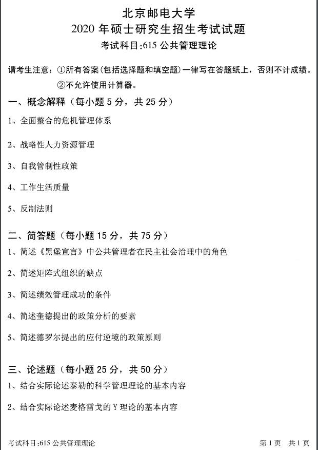 北邮考研辅导班:2020年北京邮电大学考研专业课615公共管理理论考试真题