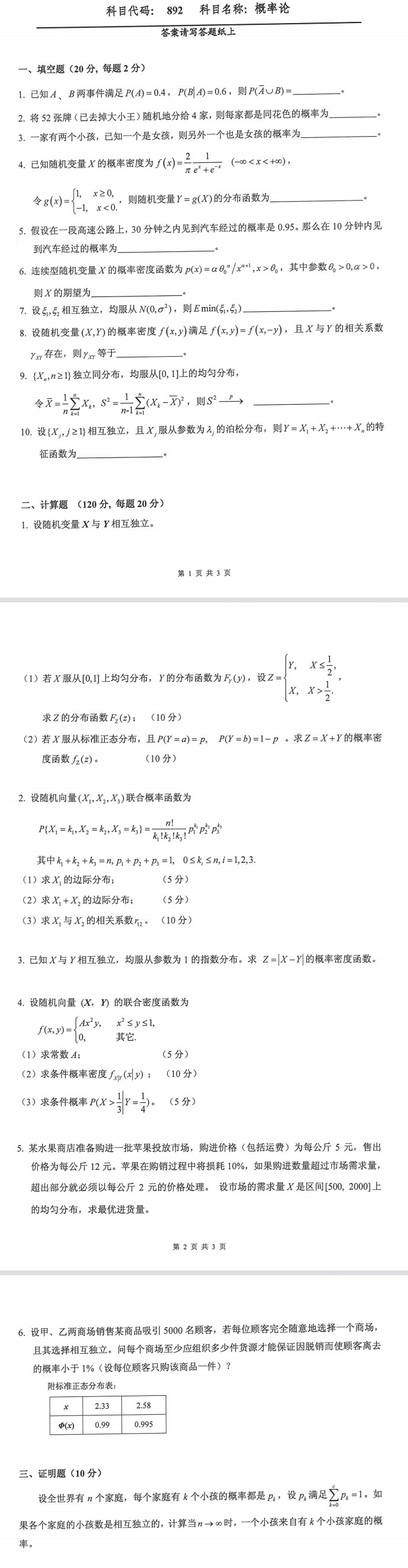 浙江财经大学考研辅导班:2021年浙江财经大学硕士考研真题之892概率论