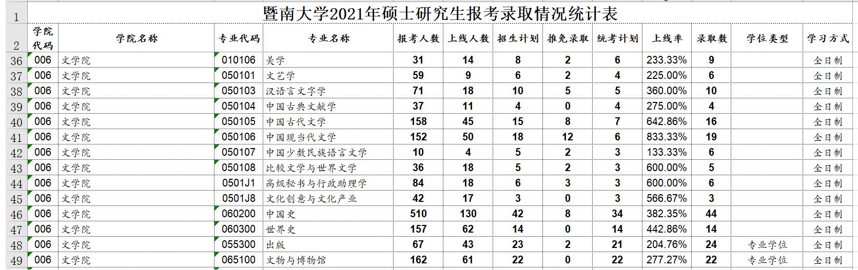 专业的选择没有太多犹豫,古代文学是我一直以来的兴趣所在。虽然在定专业的过程中,因为暨大古代文学过于炙手可热有过犹豫,但最后还是选择遵从自己的内心。但在这里还是介绍一下暨大古代文学的情况,以下是暨南大学2021年硕士研究生的报录比情况。(这些资料官网中都可以查到,信息透明也是暨大的优势)