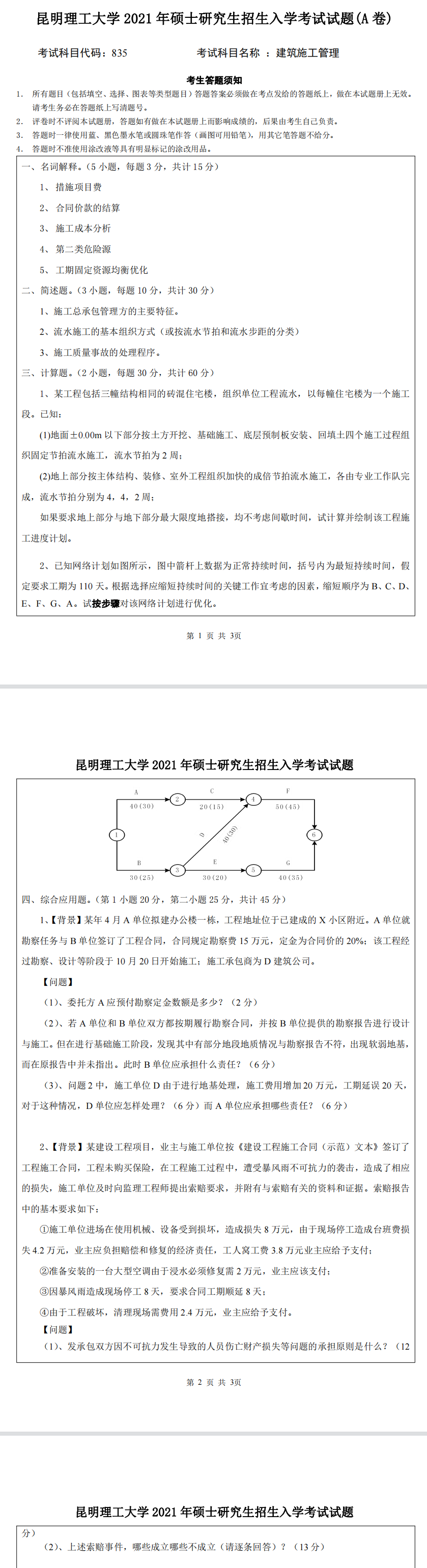 昆明理工大学考研辅导班:2021年昆明理工大学835建筑施工管理考研真题