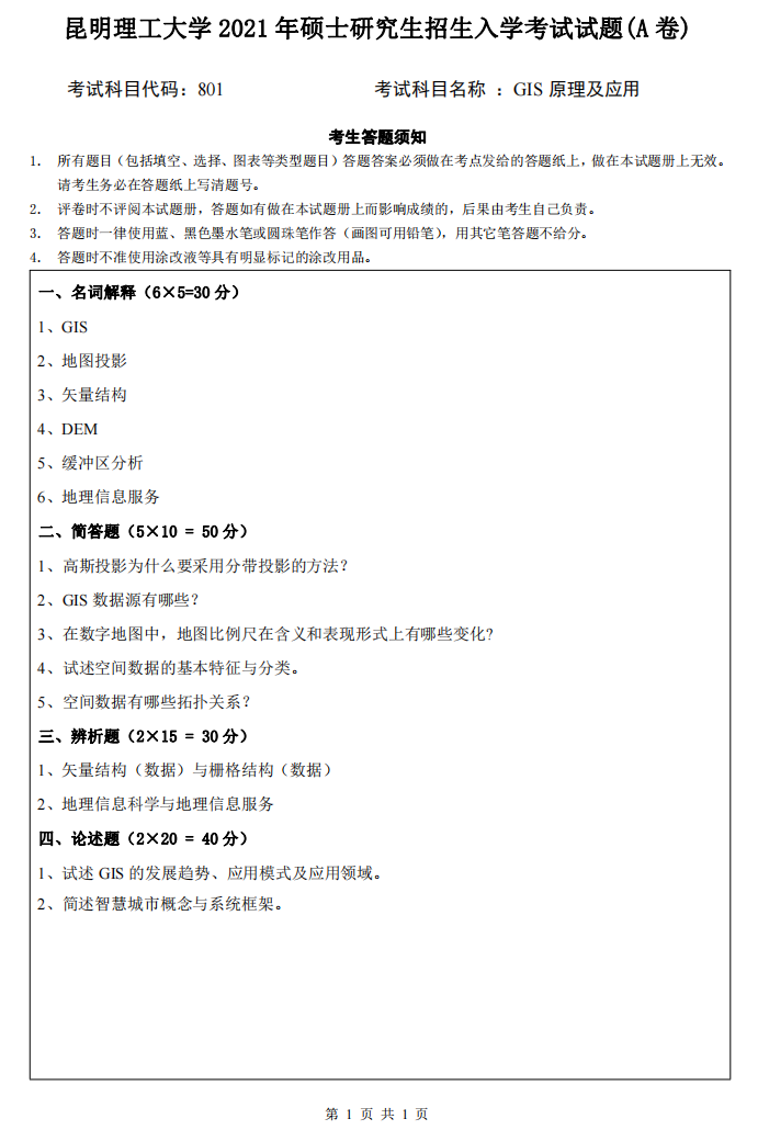昆明理工大学考研辅导班:2021年昆明理工大学大地测量学与测量工程专业考研801GIS原理及应用试题-新祥旭