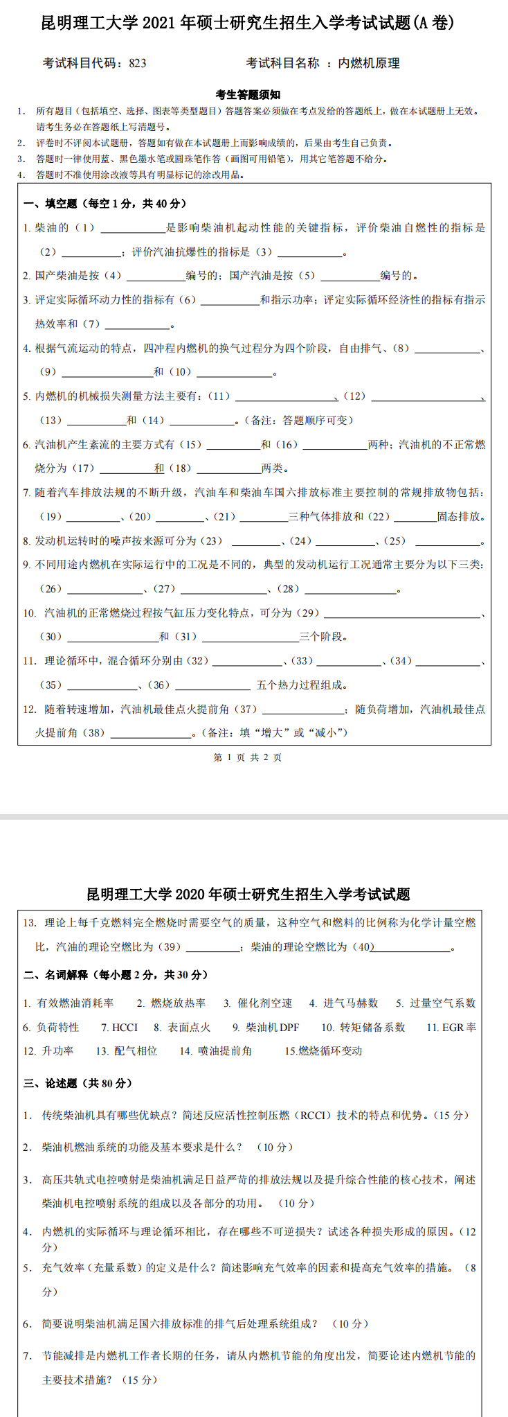 昆明理工大学考研辅导班:2021年昆明理工大学动力机械及工程考研823内燃机原理试题-新祥旭