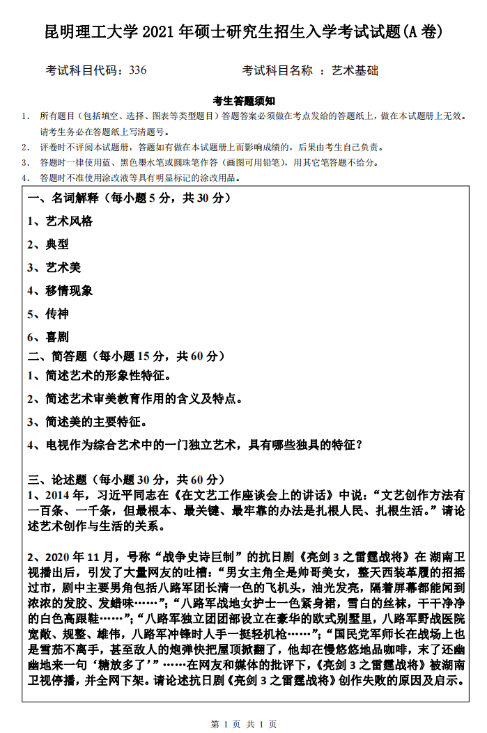 昆明理工大学考研辅导班:2021年昆明理工大学广播电视专硕考研336艺术基础试题-新祥旭