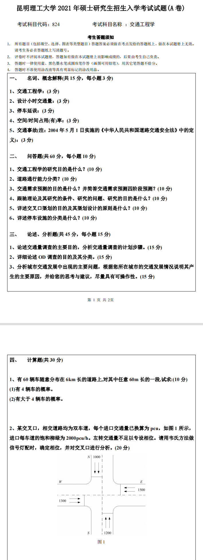 昆明理工大学考研辅导班:2021年昆明理工大学交通工程学院考研824交通工程学考试真题