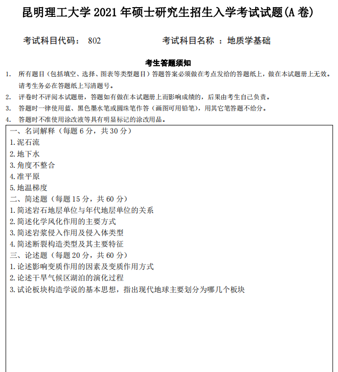 昆明理工大学考研辅导班:2021年昆明理工大学矿物学考研802地质学基础考试真题-新祥旭