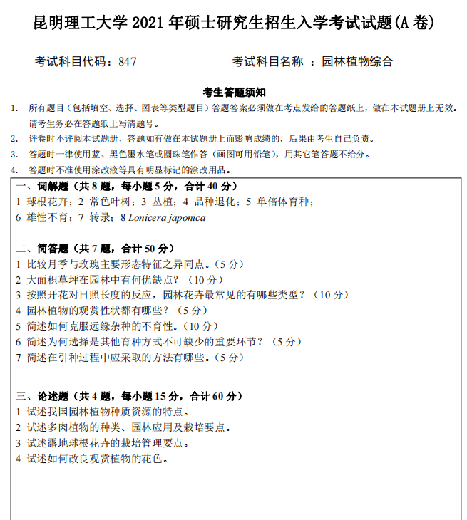 昆明理工大学考研辅导班:2021年昆明理工大学研究生入学考试847园林植物综合考研真题