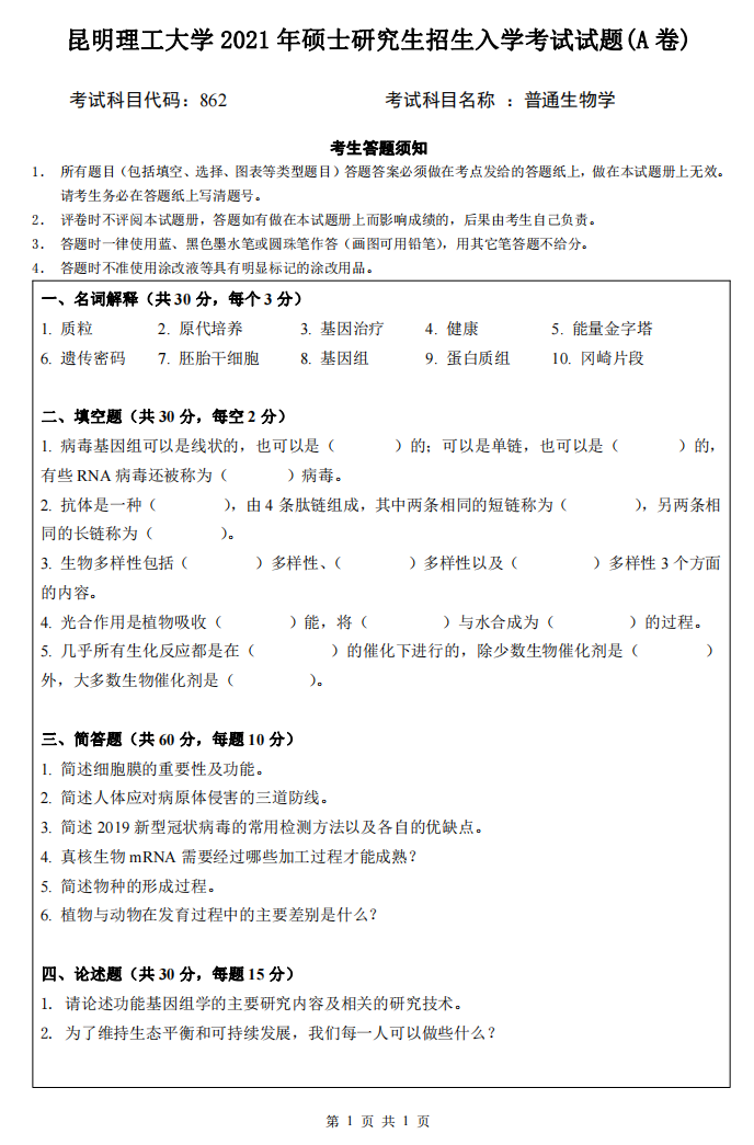 昆明理工大学考研辅导班:2021年昆明理工大学研究生入学考试862普通生物学考研真题