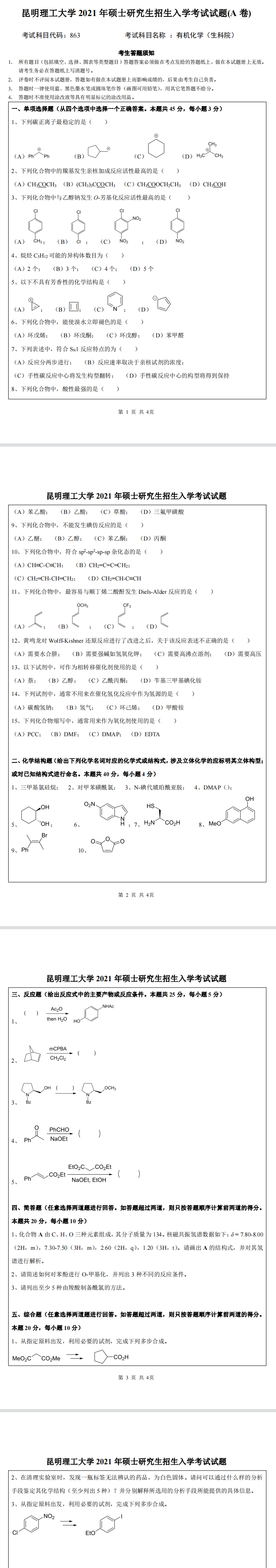 昆明理工大学考研辅导班:2021年昆明理工大学研究生入学考试863有机化学考研真题