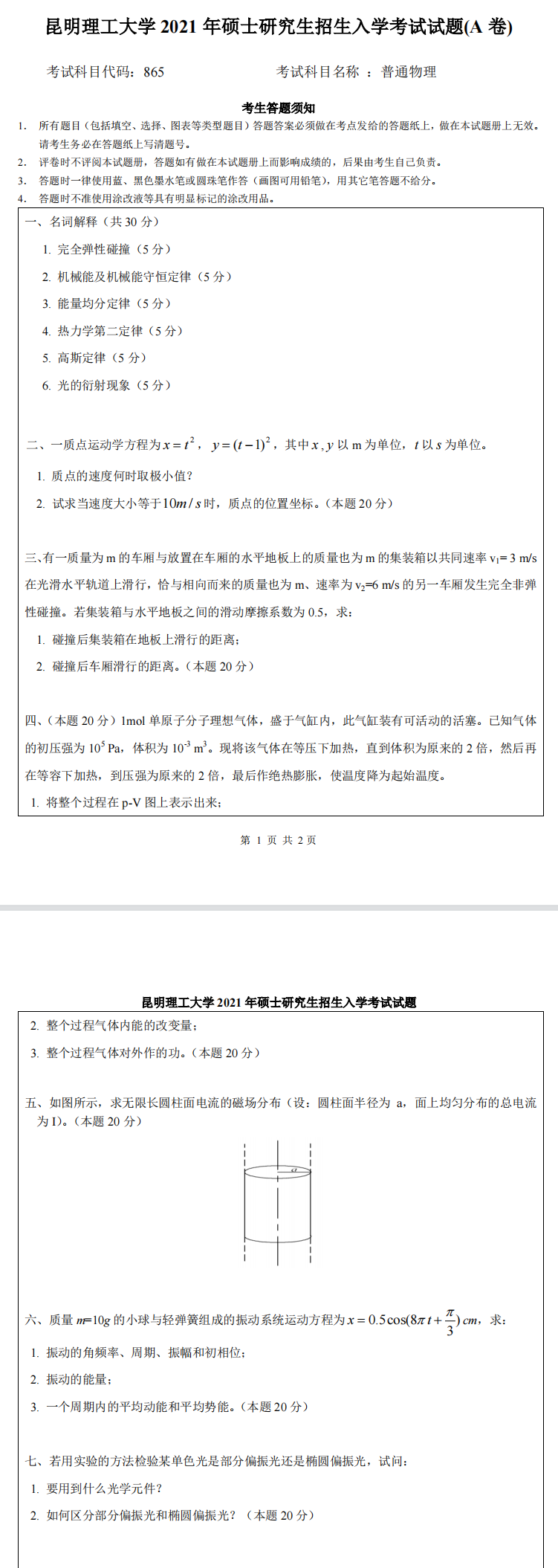 昆明理工大学考研辅导班:2021年昆明理工大学研究生入学考试865普通物理考研真题-新祥旭