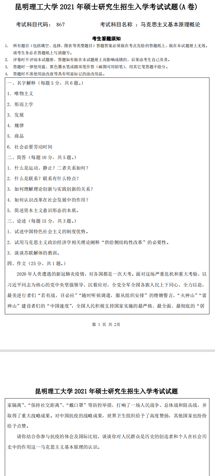 昆明理工大学考研辅导班:2021年昆明理工大学研究生入学考试867马克思主义基本原理概论考研真题