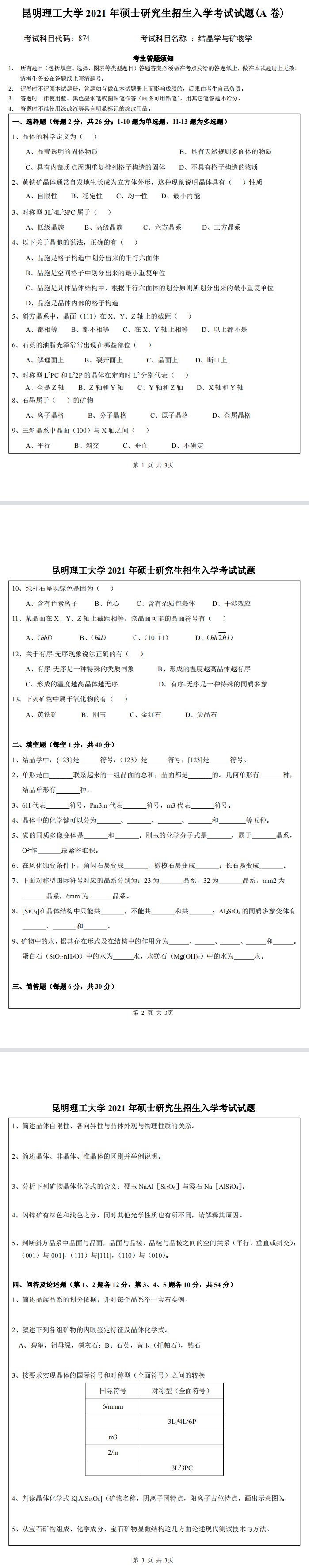 昆明理工大学考研辅导班:2021年昆明理工大学研究生入学考试874结晶学与矿物学考研真题