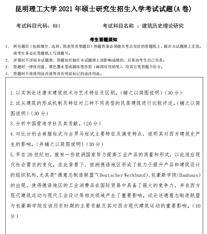 昆明理工大学考研辅导班:2021年昆明理工大学研究生入学考试881建筑历史理论研究考研真题