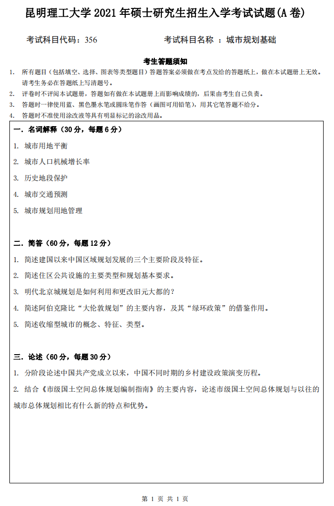 昆明理工大学考研辅导班:昆明理工大学2021年研究生入学考试356城市规划基础考研真题