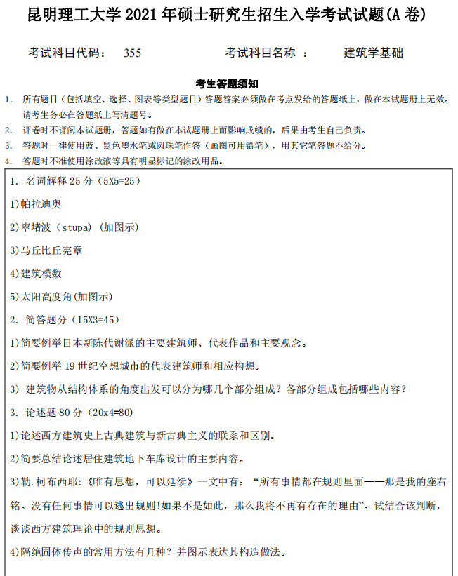 昆明理工大学考研辅导班:昆明理工大学2021年研究生入学考试355建筑学基础考研真题
