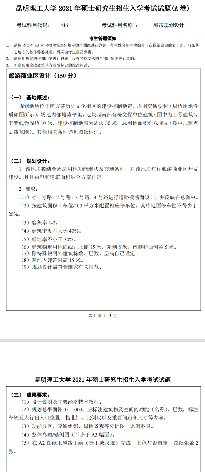昆明理工大学考研辅导班:昆明理工大学2021年研究生入学考试446城市规划设计考研真题