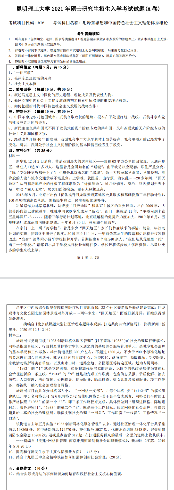 昆明理工大学考研辅导班:昆明理工大学2021年研究生入学考试616毛泽东思想与中国特社概论考研真题