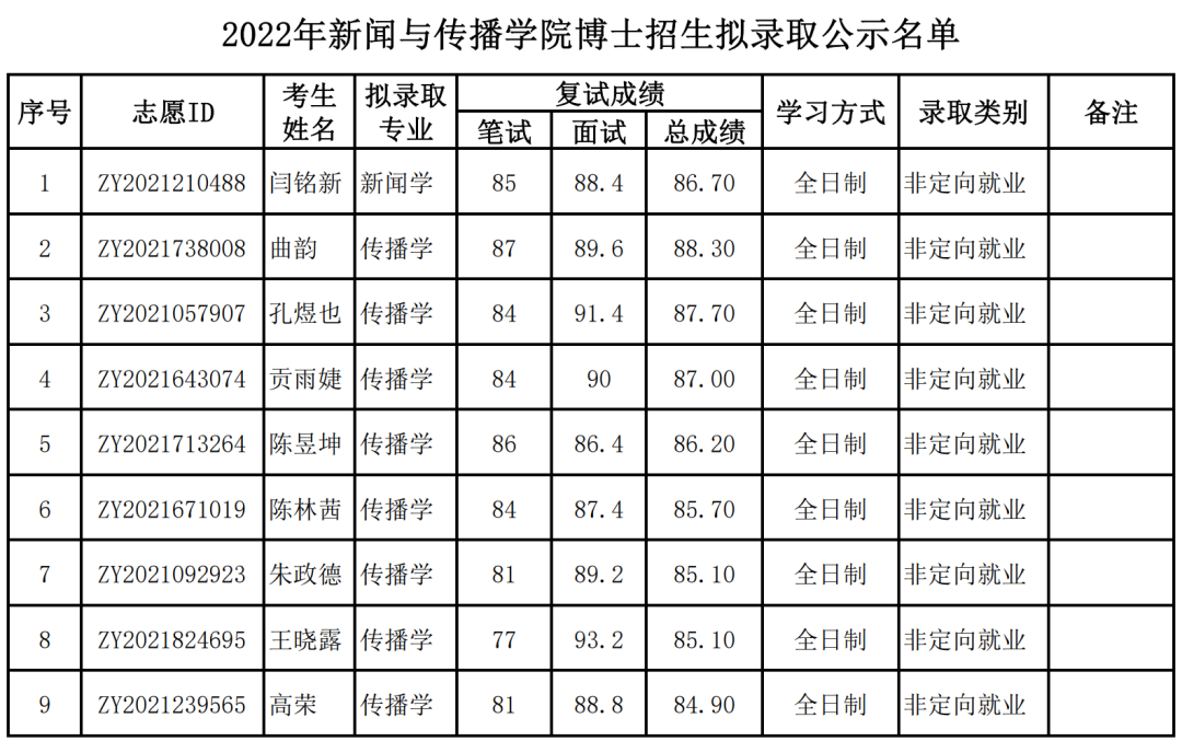 北京大学2022年新闻与传播学院博士招生拟录取公示名单