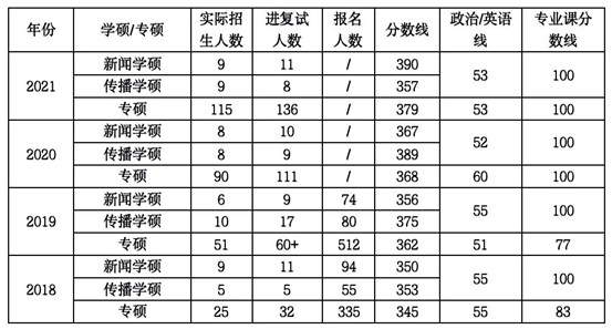 从表格能够清楚的看出,民大专硕招生人数真的呈直线上涨,据我了解到的信息来看,2022年虽然学长姐极力声称不会达到21年的盛况,但确确实实最终招了122个专硕,分数线381分也仅仅比去年涨了两分,但今年的话大家440普遍分数较低,有压分的嫌疑存在。从2020年开始,民大便不再公布报考人数,这就无法准确获知报录比情况,但根据各大科研机构的信息收集,21年报录比大概在1:12左右,22年估计高一些但也不算爆,这个比例在新传专业里面来说其实再正常不过了。