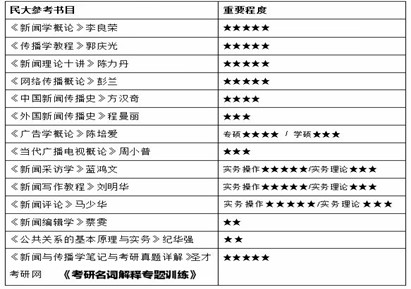 得专业课者得天下,民大没有给具体的参考书,但是总体来说它考的比较基础,但又什么都考,传播学、新闻学、广告学、公关、广电、采写编评可以说没有它不考的,各个渠道的参考书其实也都大同小异,把一些重点知识掌握住才是王道。