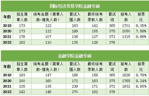 贸大金融专硕分两个学院进行招生,金融学院和国际经济贸易学院,两个学院初试内容一模一样,复试统一划线,但复试内容略有区别,金融学院侧重考察专业英语,国贸学院侧重考察日常口语对话。近几年两个学院的录取情况如下: