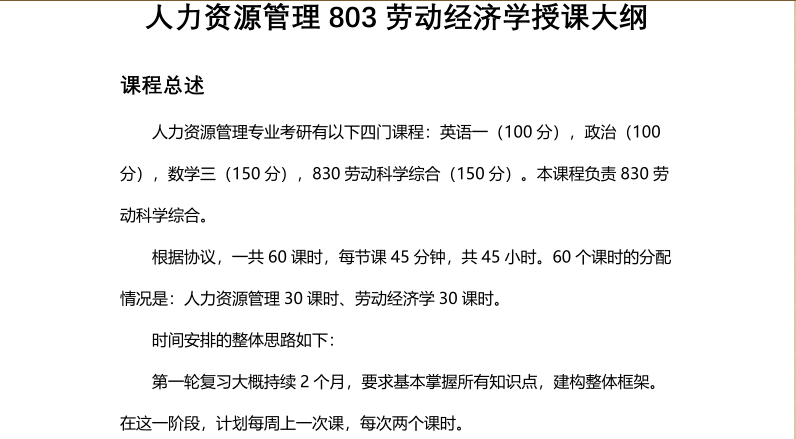 中国人民大学人力资源管理专业考研专业课803劳动经济学综合辅导课程授课计划大纲