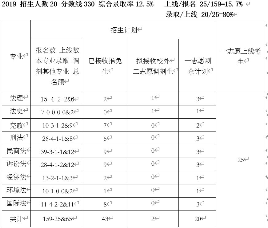 考研难度方面,山东大学法学院学术硕士每年招生20人左右,分为九个方向(法理学、法律史、宪法与行政法学、刑法、民商法学、诉讼法学、经济法、环境法、国际法),其中民商法每年招生名额2-3人,根据山东大学已公布的报录比情况来看,最近公布的三年民商法学报录比依次为:39:3—82:4—67:6,基本符合985院校15—20比1的正常报录比,卷的不算特别夸张。从法学院整体学术硕士来看,已公布的最近三年报录比信息中,综合录取率(录取人数/报名人数)分别为:12.5%、9.7%、9.2%。