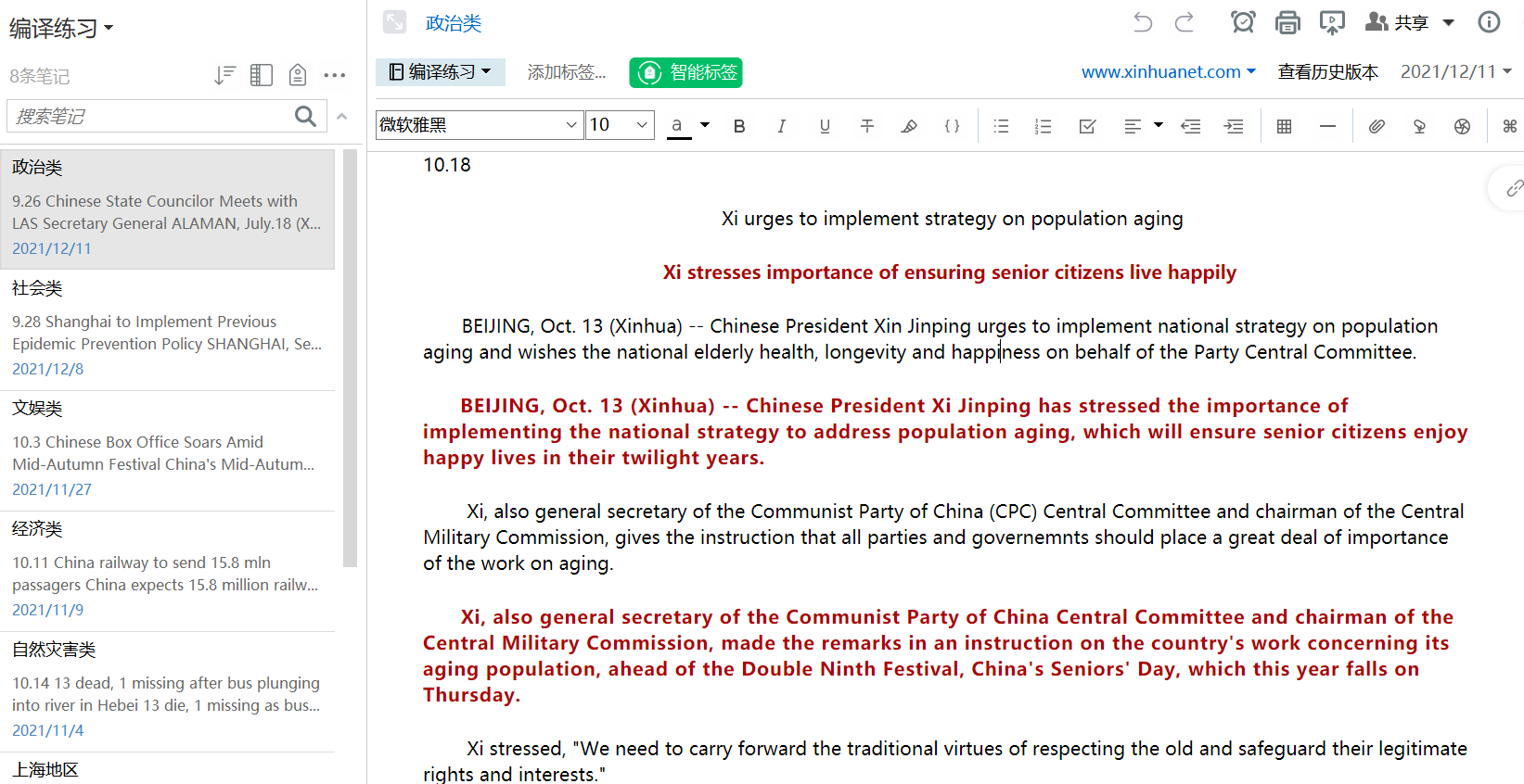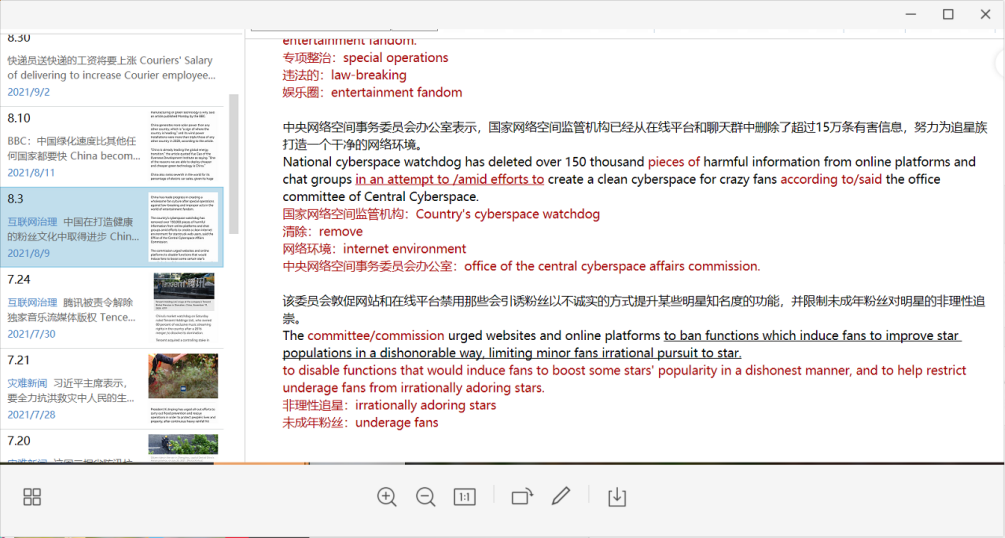 7月—8月:在掌握了基础的编译知识之后,平日里浏览新闻也更加有目的性,遇到精彩的小词与表达都会赶紧摘录下来。