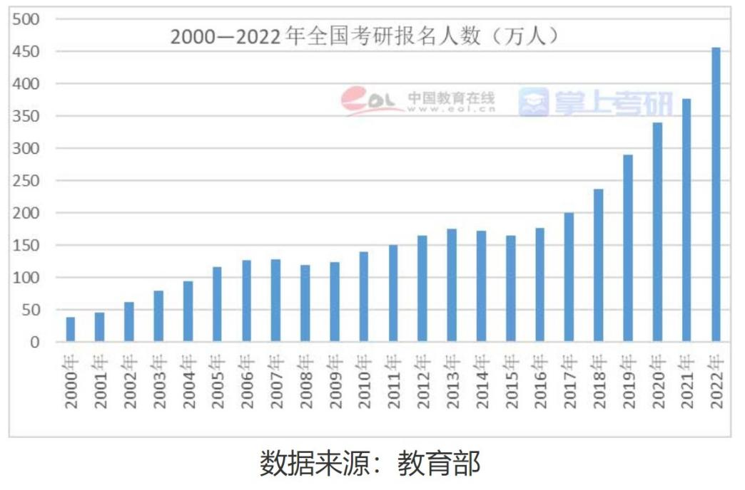 2021年参加考研的人数近377万,较2020年增加36万,增幅10.6%;2022年考研人数更是高达457万,比之21年人数增长率超过20%,在就业环境困难和疫情加持的背景下,考研竞争愈发激烈已成为不争的事实;