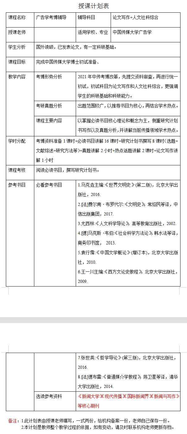 新祥旭考博一对一:2023年中国传媒大学广告学考博一对一辅导授课计划