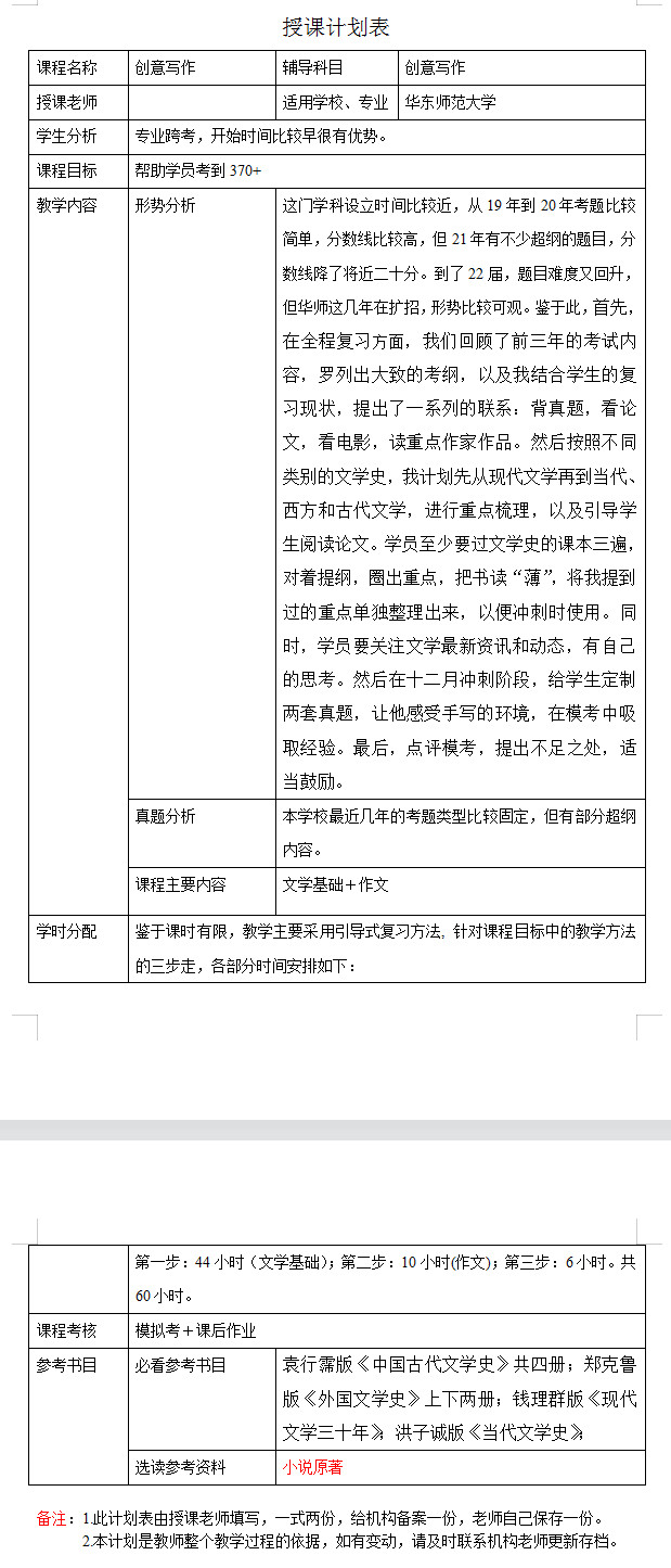 新祥旭考研一对一:2023年华东师范大学创意写作考研一对一辅导授课计划