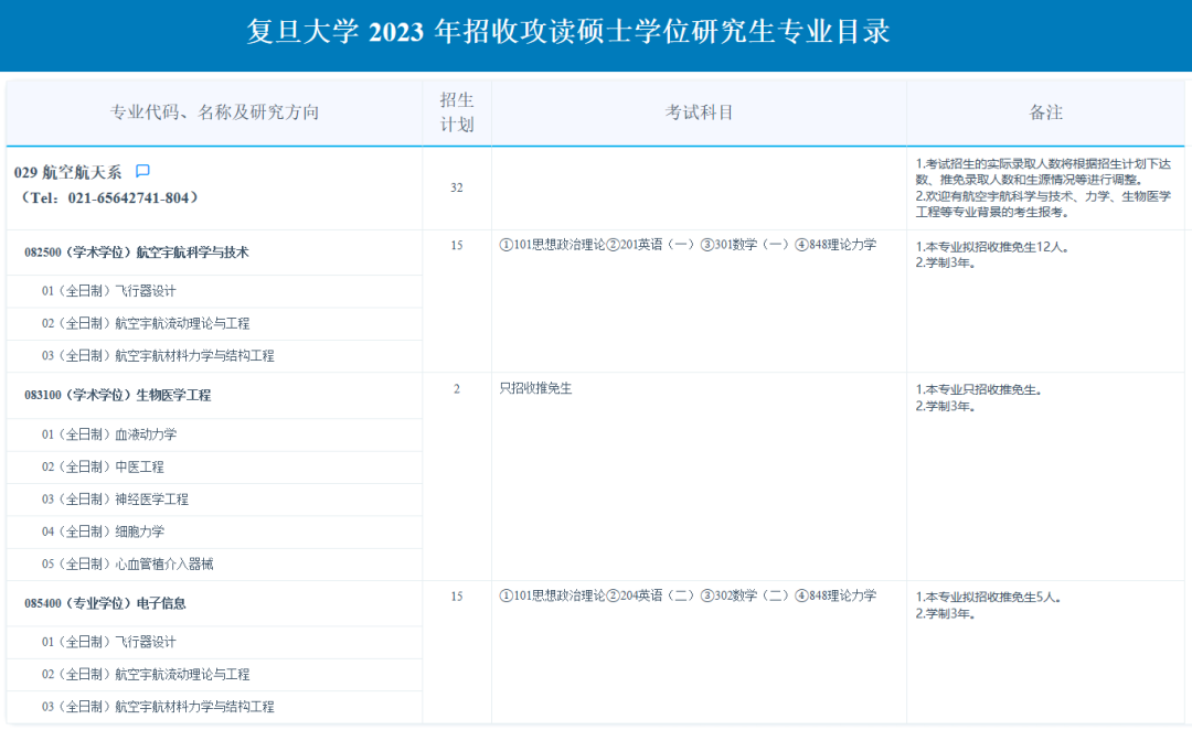 2023年复旦大学航空航天系硕士研究生专业目录