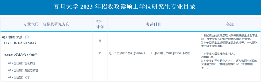 2023年复旦大学物理学系硕士研究生专业目录