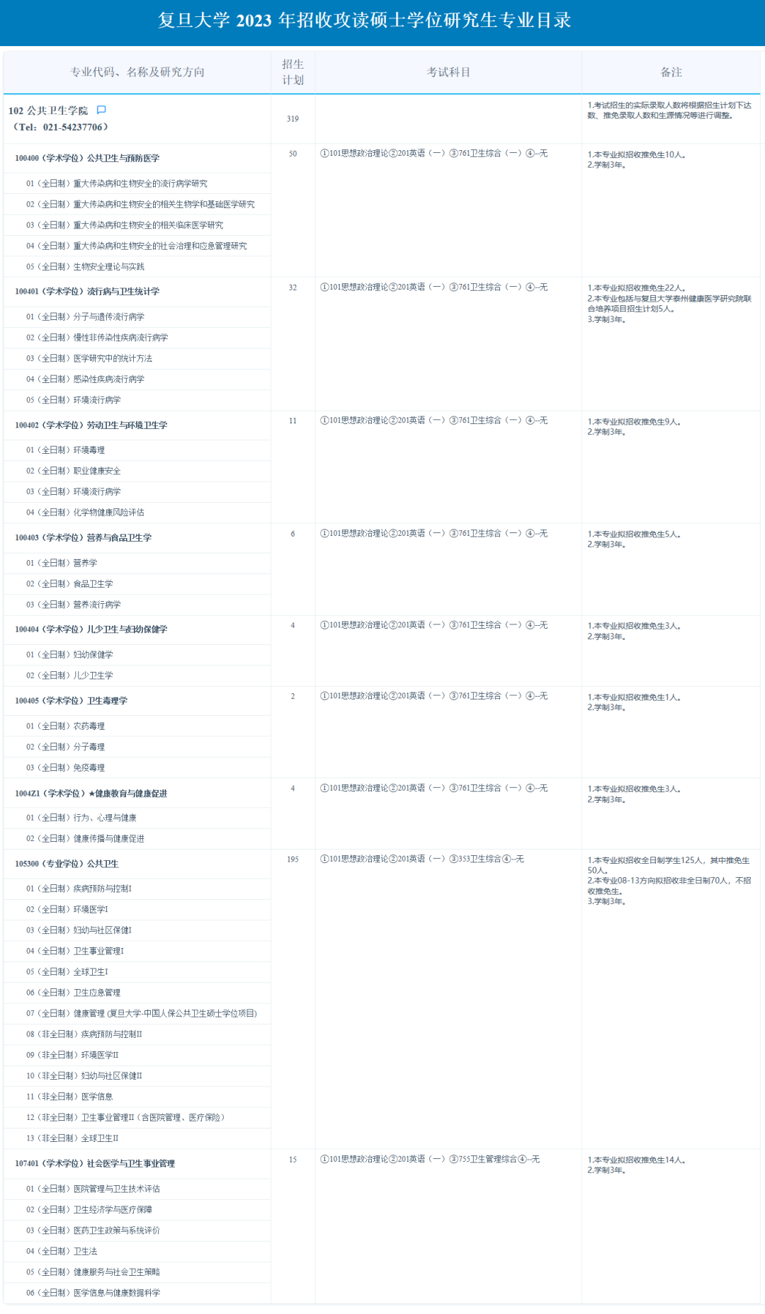 复旦大学考研辅导班:2023年复旦大学公共卫生学院考研专业目录