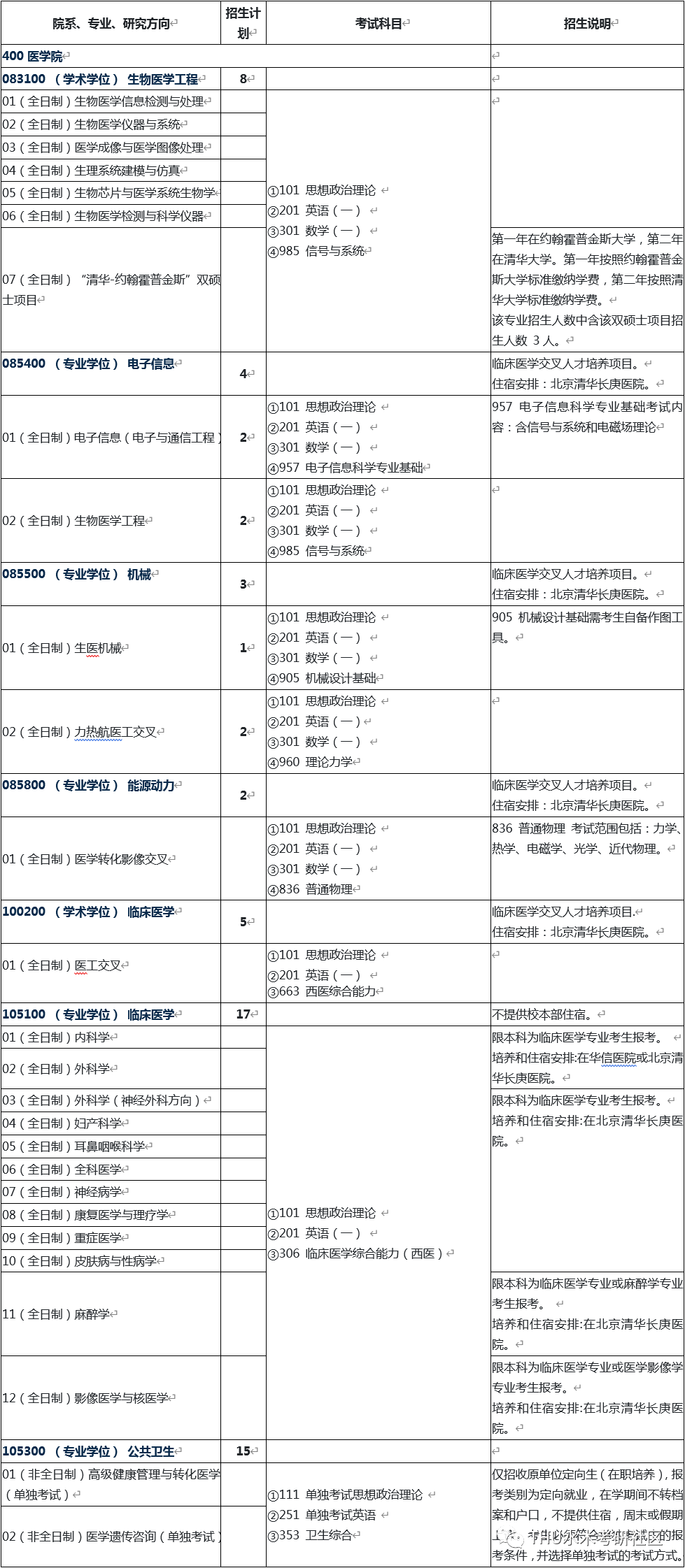 2023年清华大学医学院硕士研究生招生专业目录、招生人数