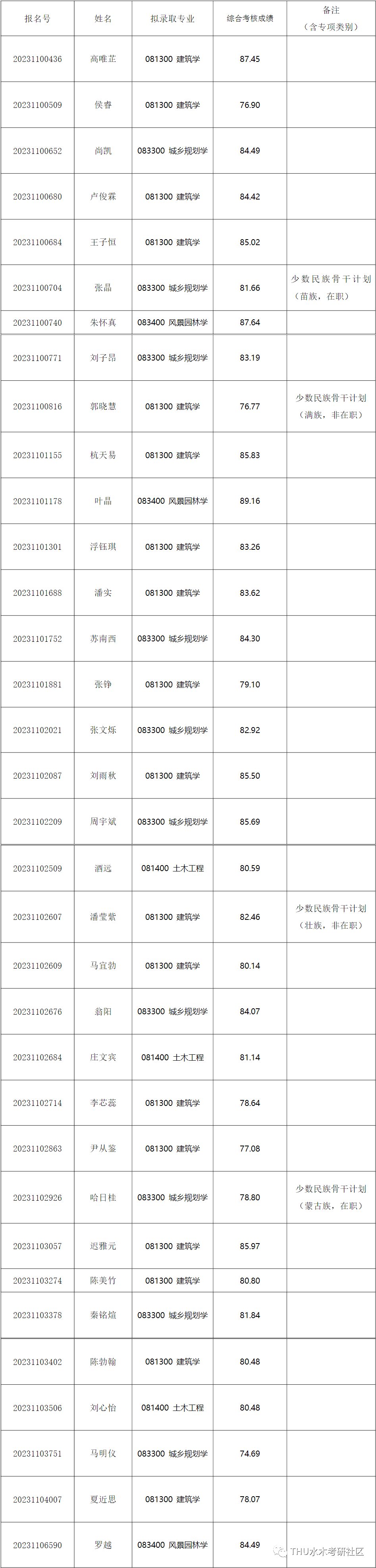 经综合考核和研究生招生工作领导小组讨论,报学校研究生招生工作领导小组批准,清华大学建筑学院2023年硕博连读博士研究生拟录取名单,现已确定,现予以公示
